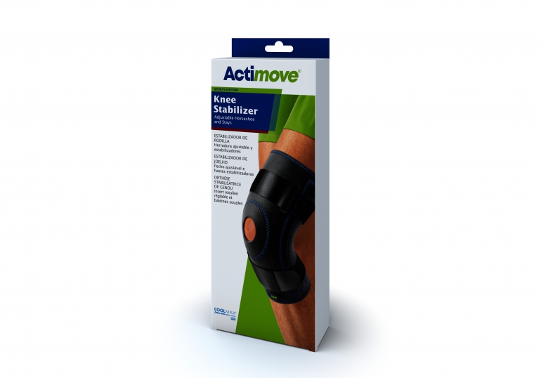 Actimove® Sports Edition aids with pain relief and healing through balanced warmth and medical compression. Offering great comfort from excellent moisture management and skin-friendly materials. Actimove Knee Stabilizer sleeve design with an adjustable horseshoe for improved patellar tracking. Stays in place with improved fit through elastic hook and loop support strap.